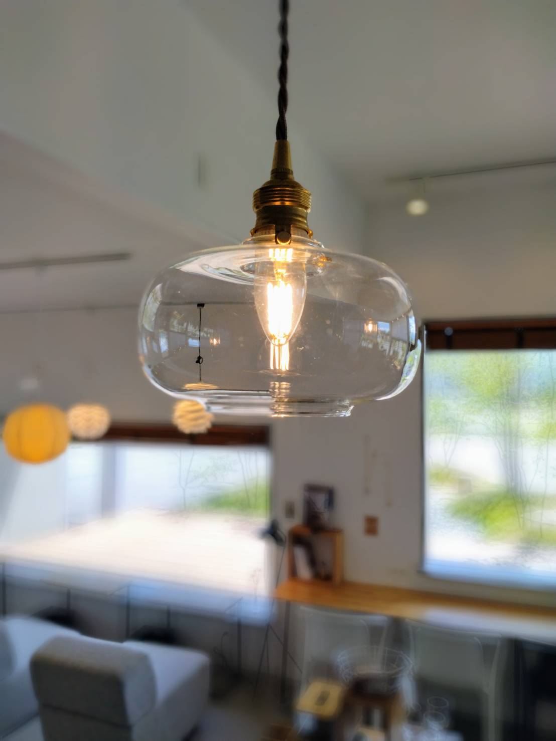 ガラスシェードは、点灯すると部屋全体に明かりが広がるため、昼間消灯していても自然光を集めて空間に抜け感を生みます。