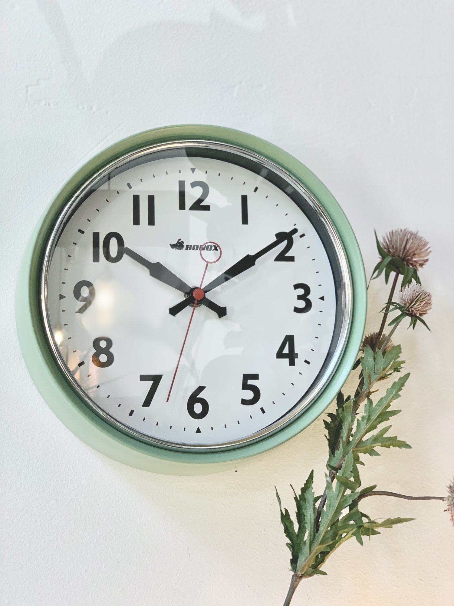 なんとも言えないマットなグリーンが可愛らしいウォールクロック💚