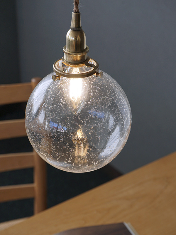 まるで水中にいるような泡をとじこめたガラスシェードです。灯りを点けると気泡が光を通し、壁にぷつぷつとしたやわらかい模様を映し出します。