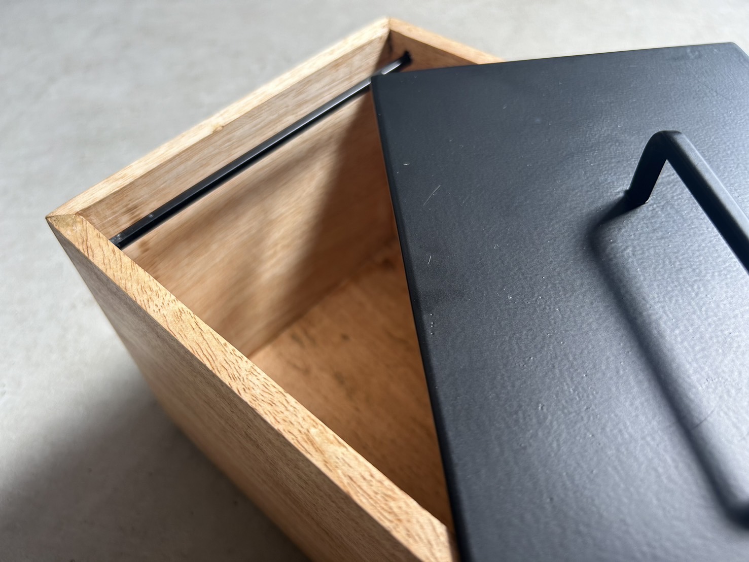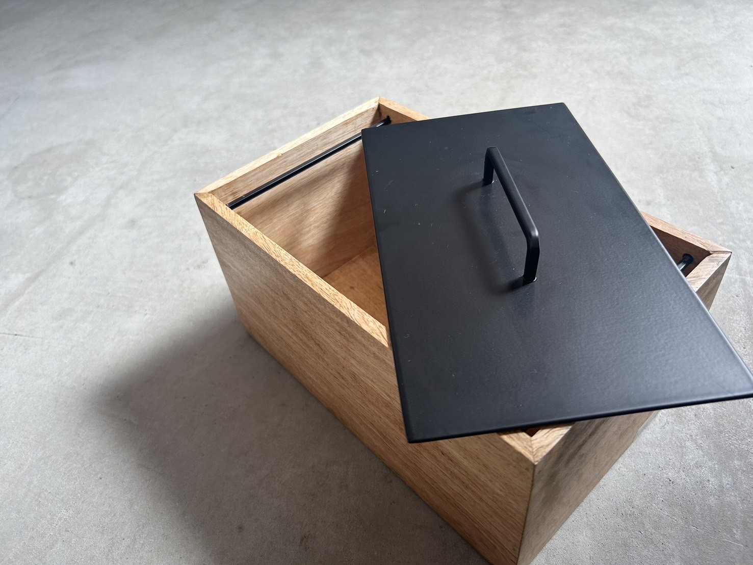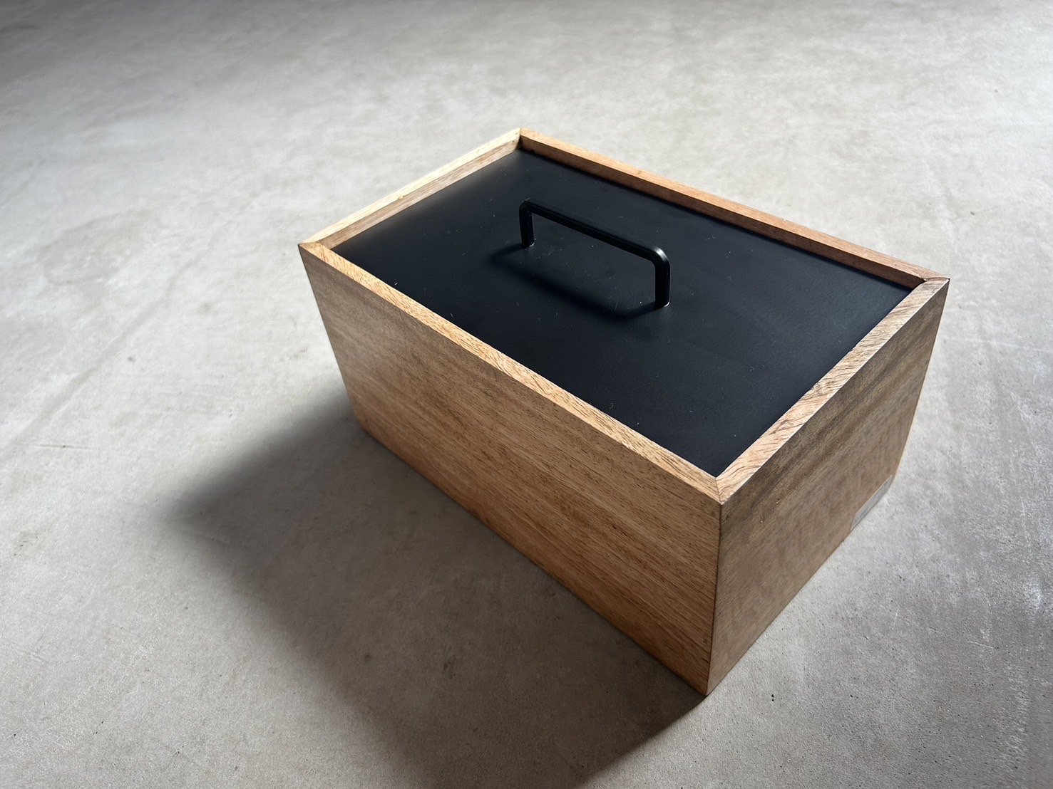 スタイリッシュなフォルムと、マンゴーウッドの素材感が印象的なストレージボックス。
