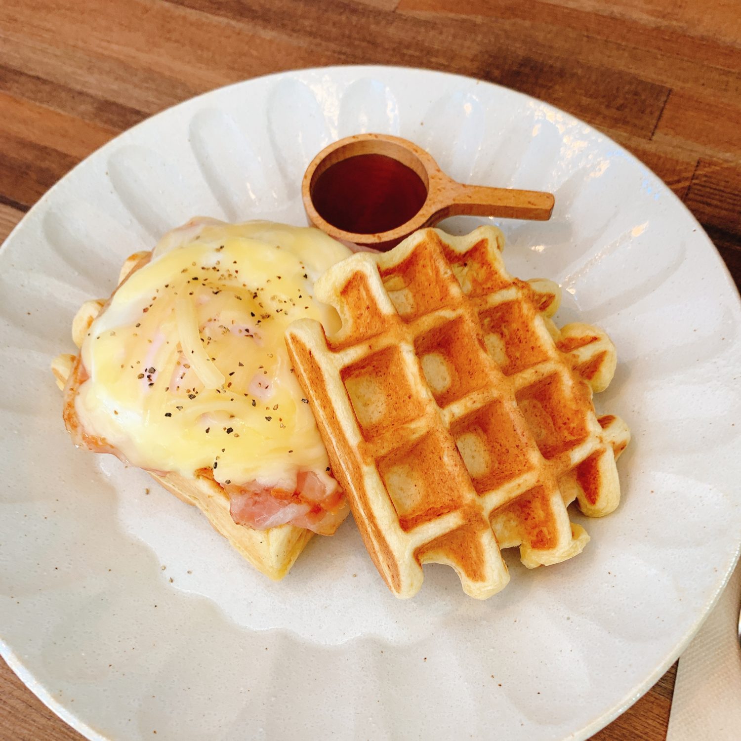 今日のお昼にいかがでしょうか??↑人気のベーコンエッグワッフルです。