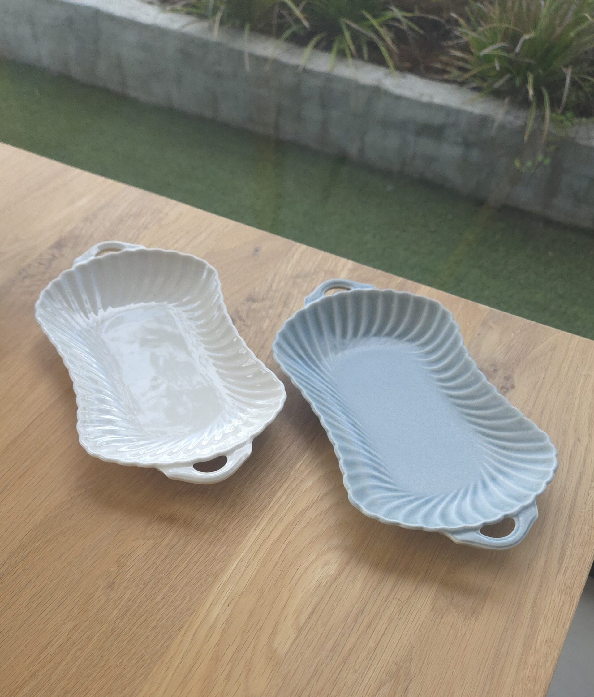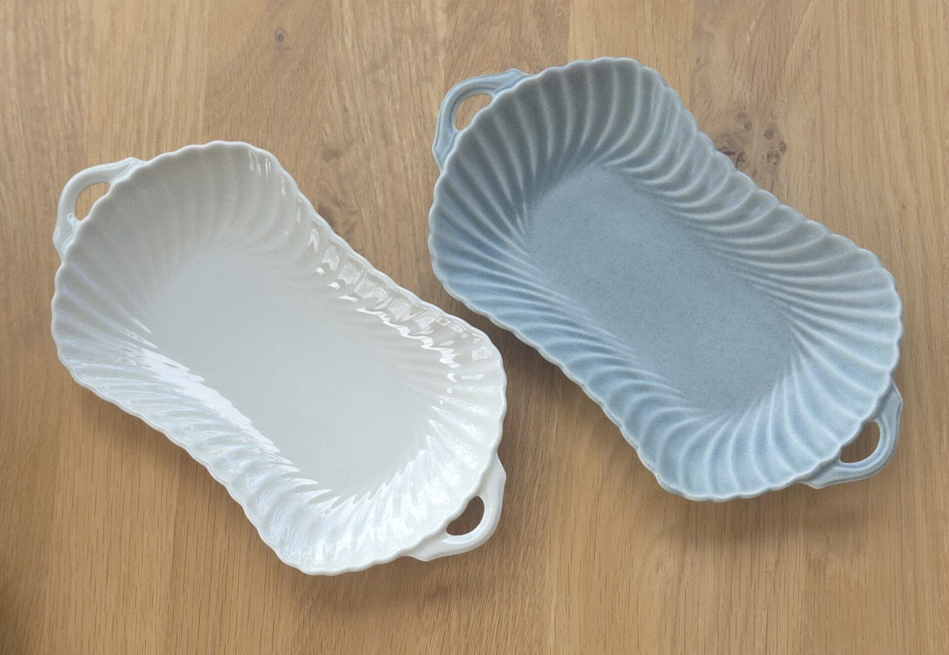 すっきりとした印象の磁器土にやわらかな波のようなレリーフがリズムよくデザインされています𓍯