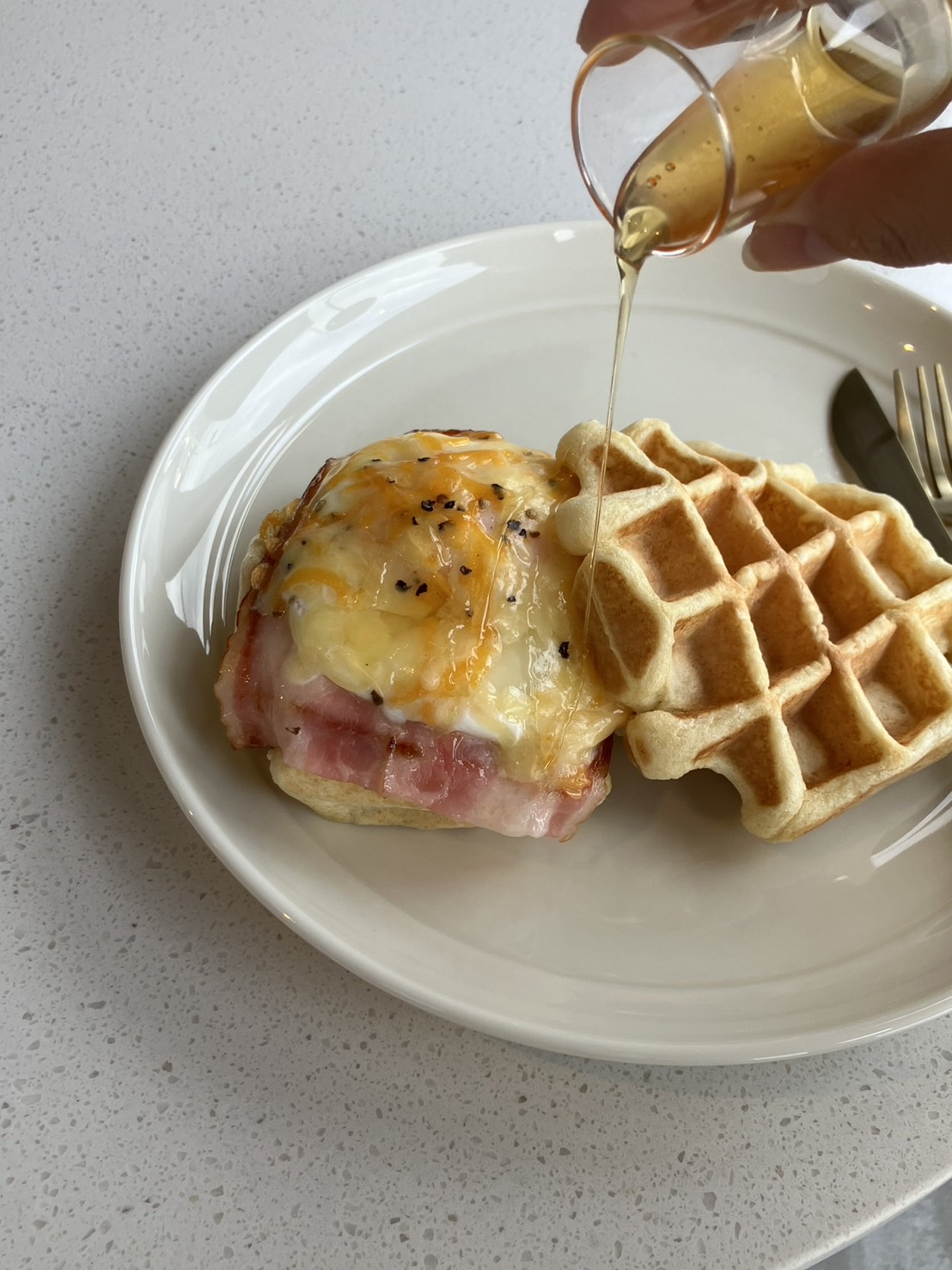 焼きたてふわふわののお豆腐ワッフルにベーコンエッグをトッピング。