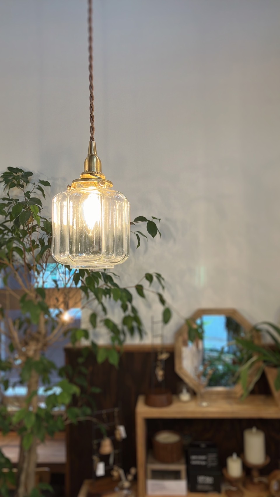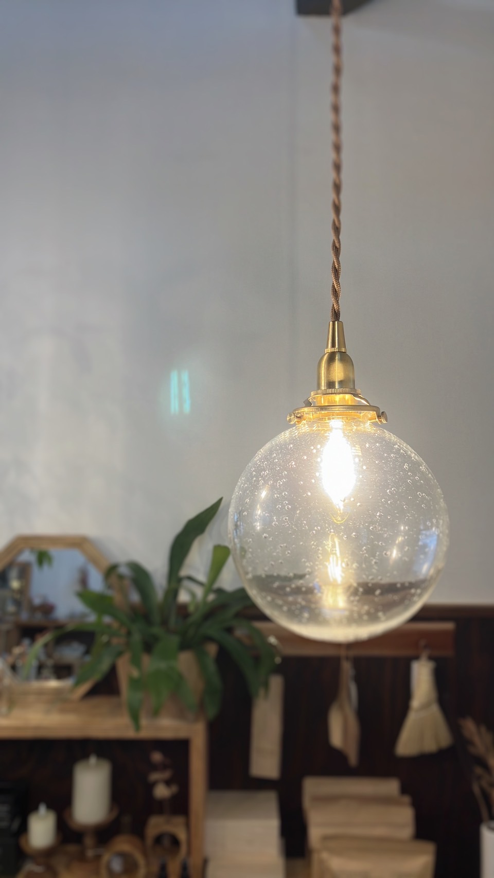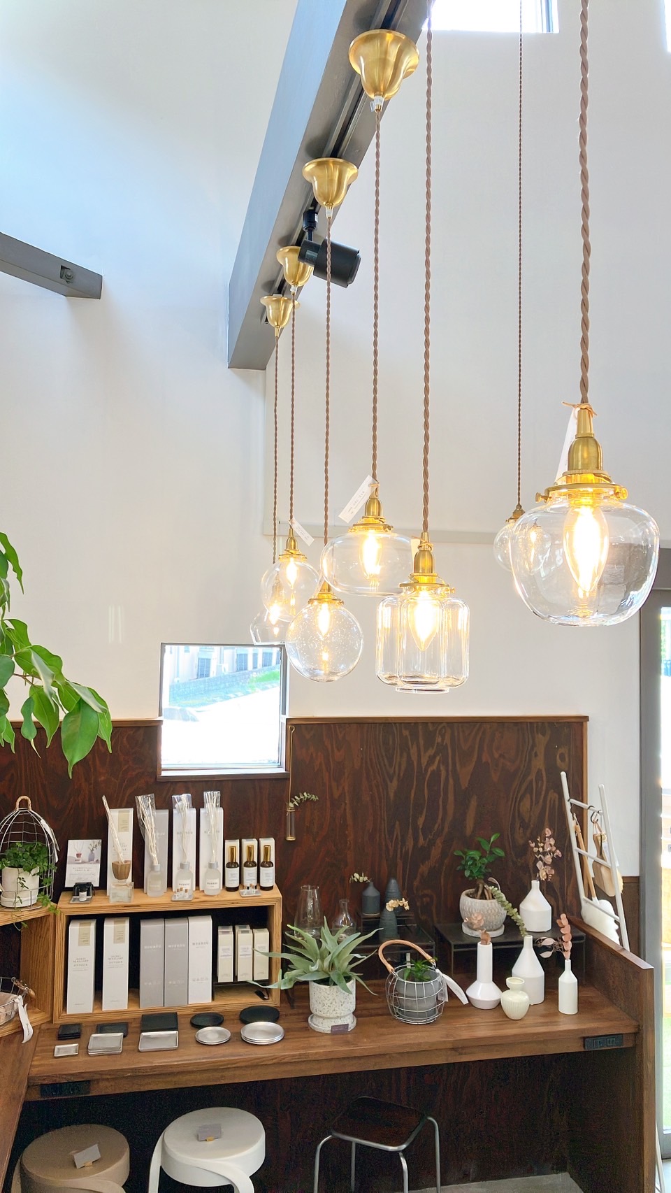 ガラスのペンダントライトが展示されています