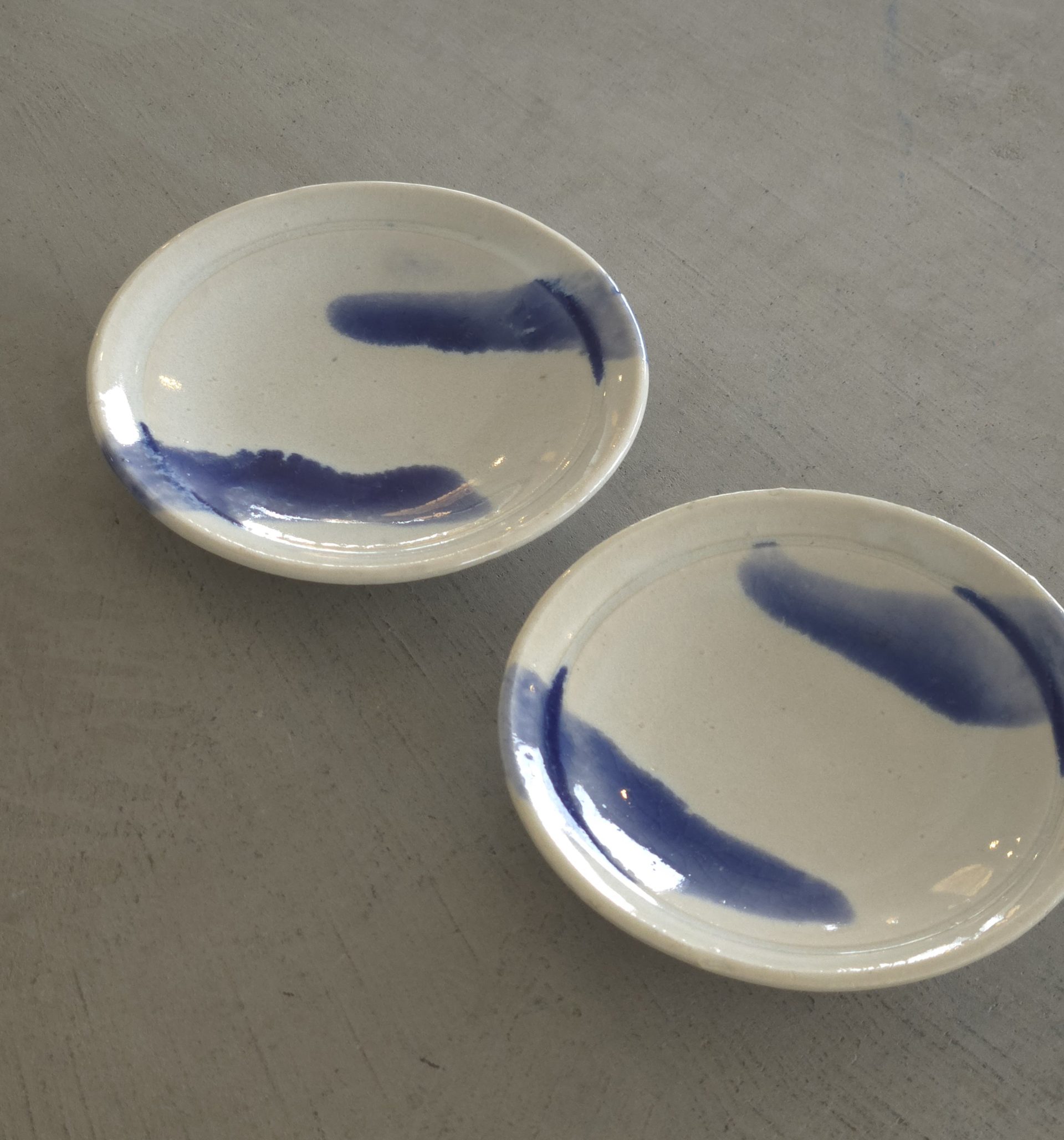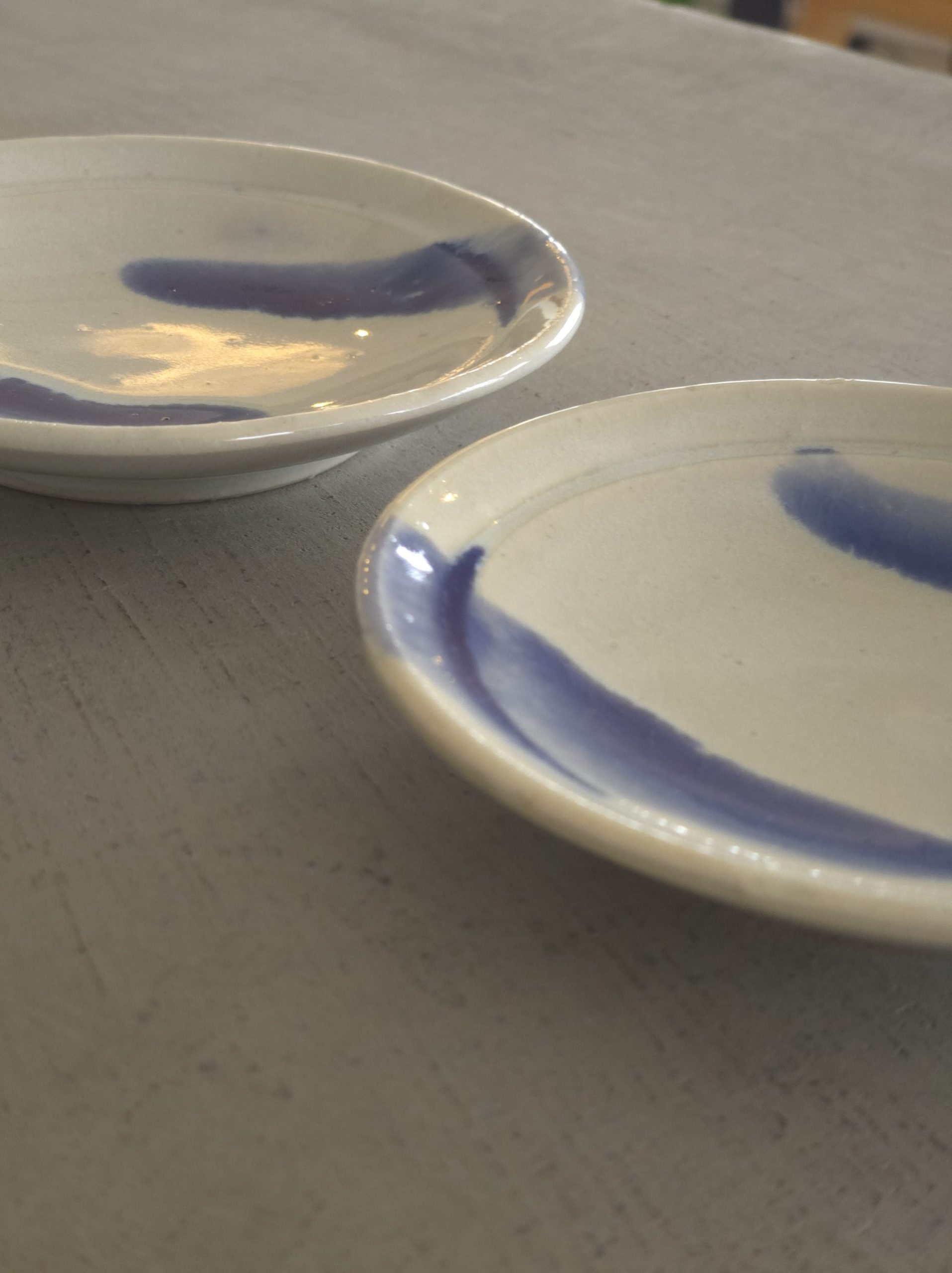ややクリームがかった白地に、藍色の筆跡のような模様が大胆に施されており、シンプルながらも個性のあるデザインとなっています𓅯