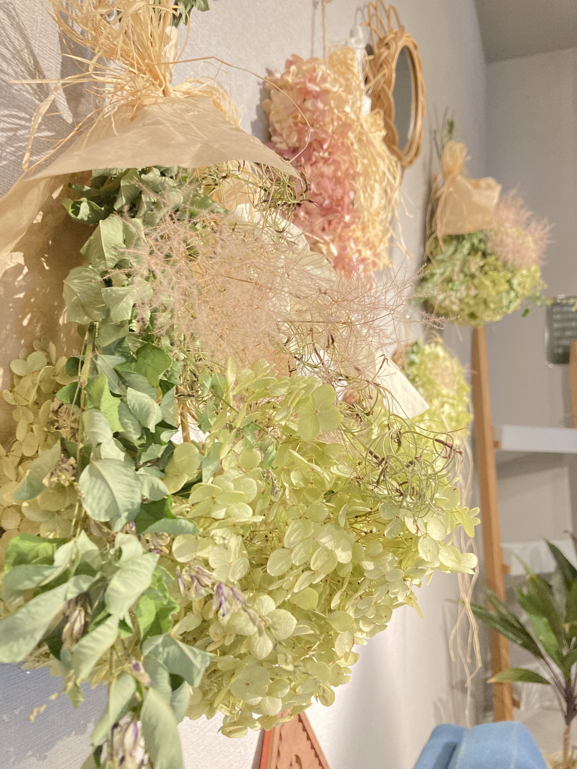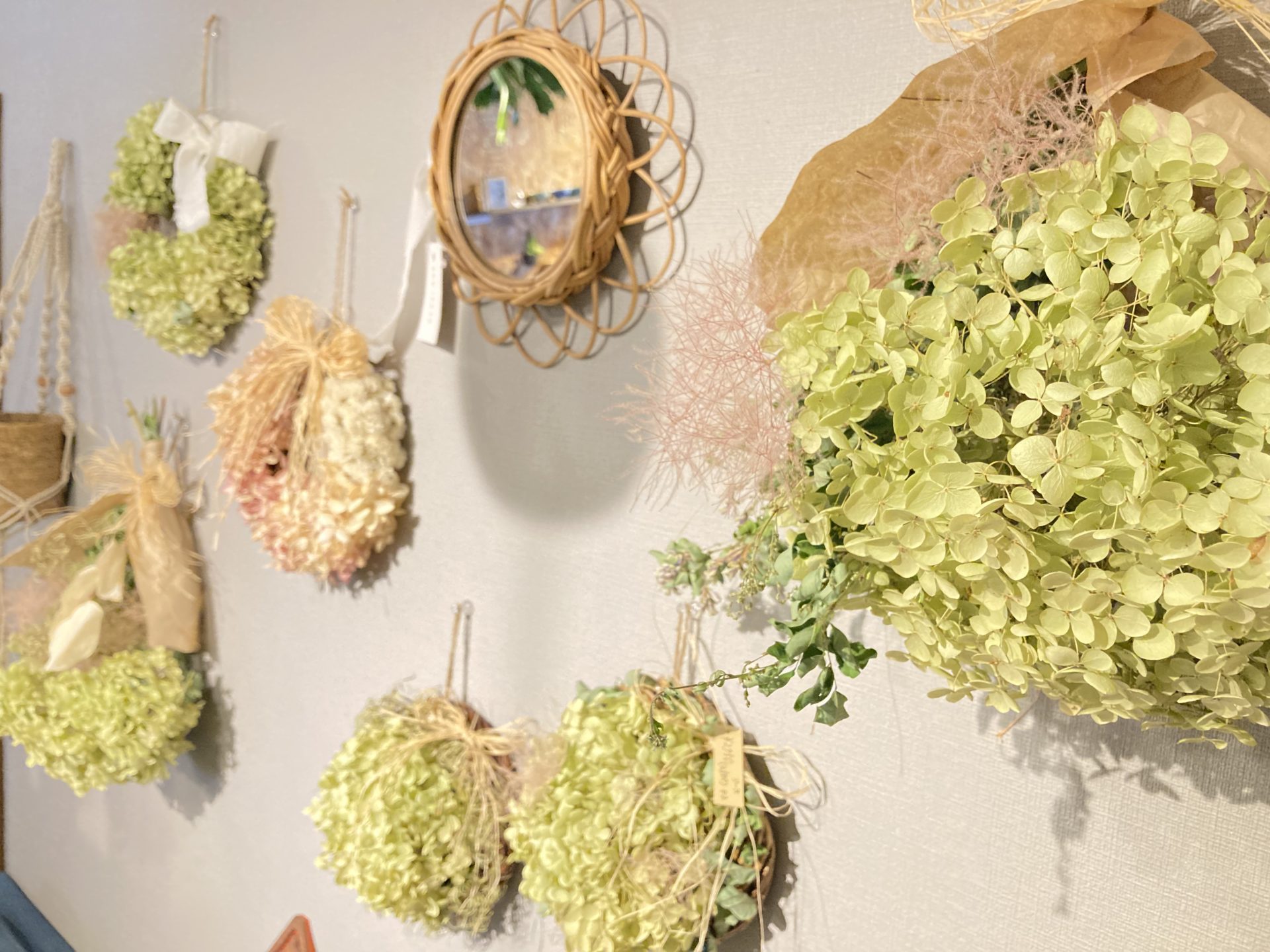 黄緑鮮やかなスワッグと可愛らしいピンク色のリース等、大小取り揃えています😊