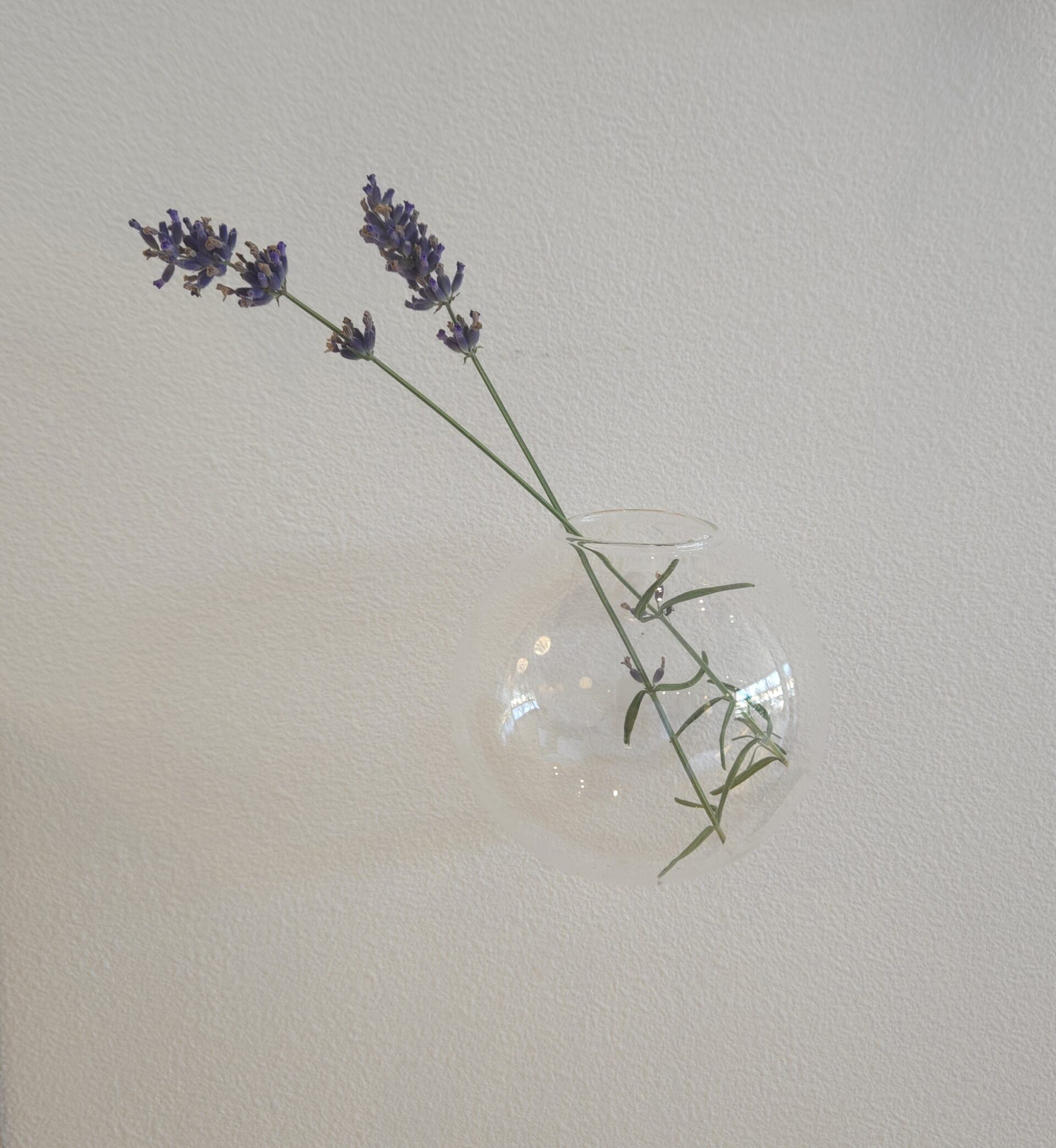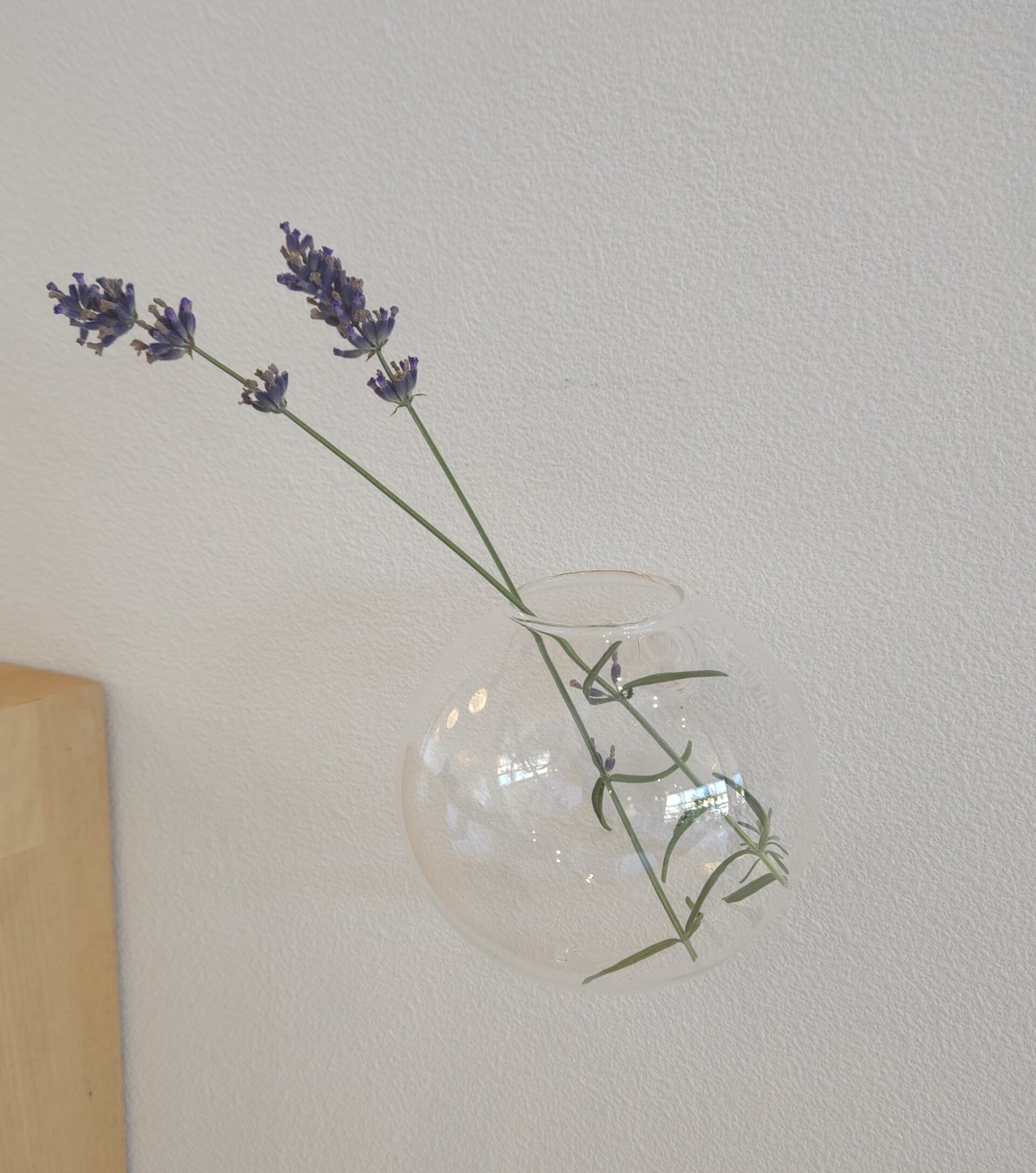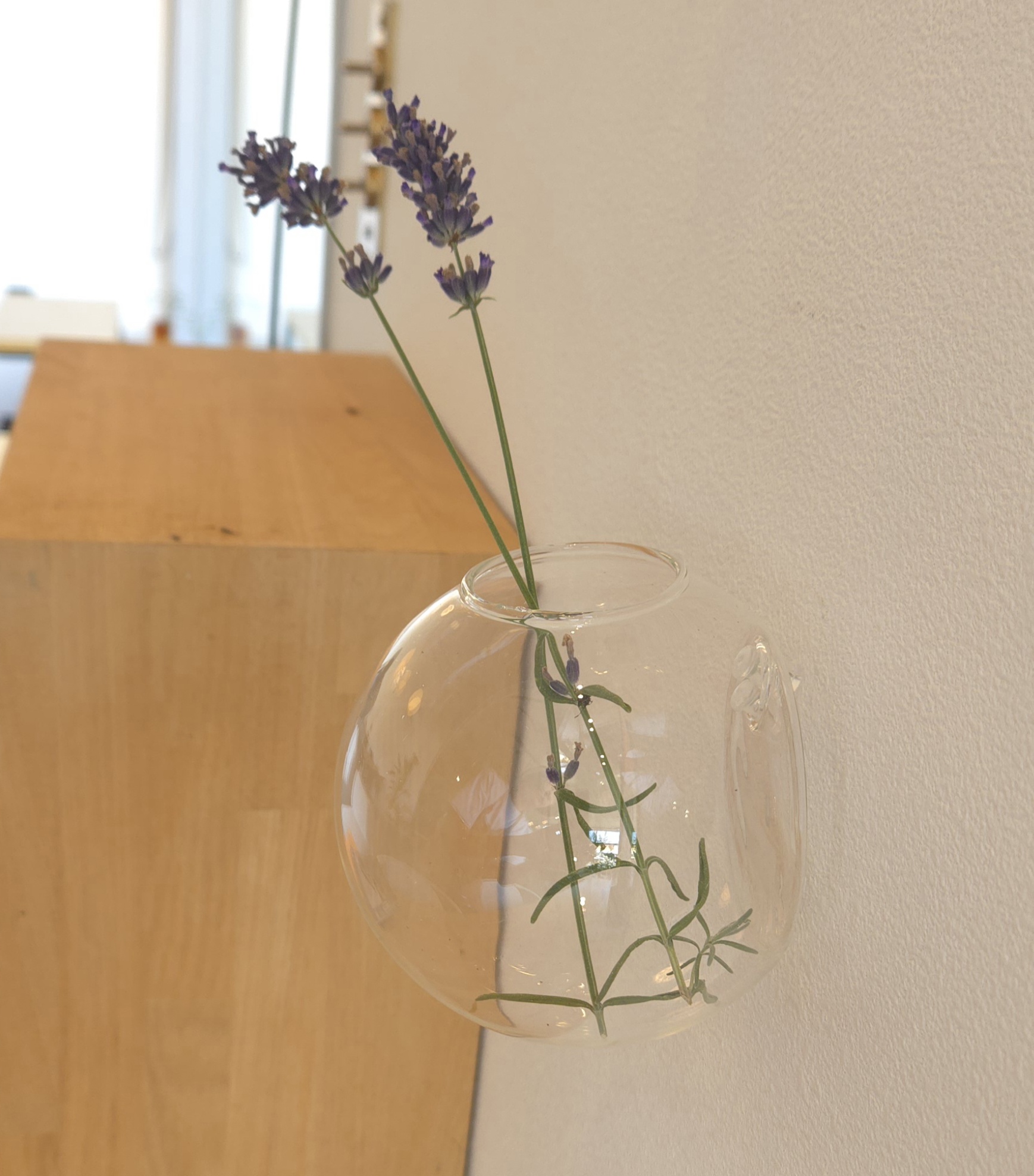 壁にそっと浮かぶように設置できる、丸いフォルムが印象的なガラスのプランターポット𓇚