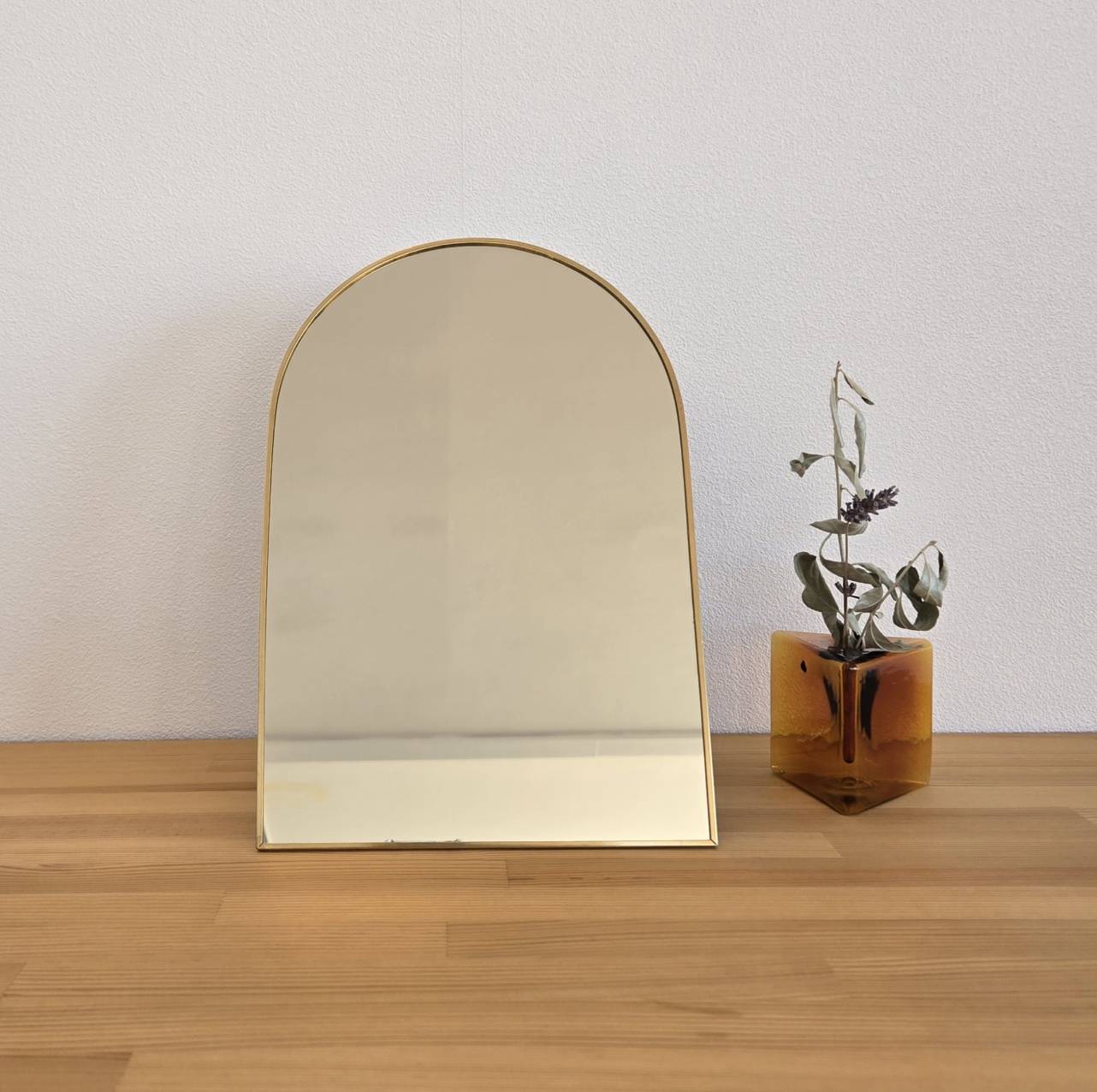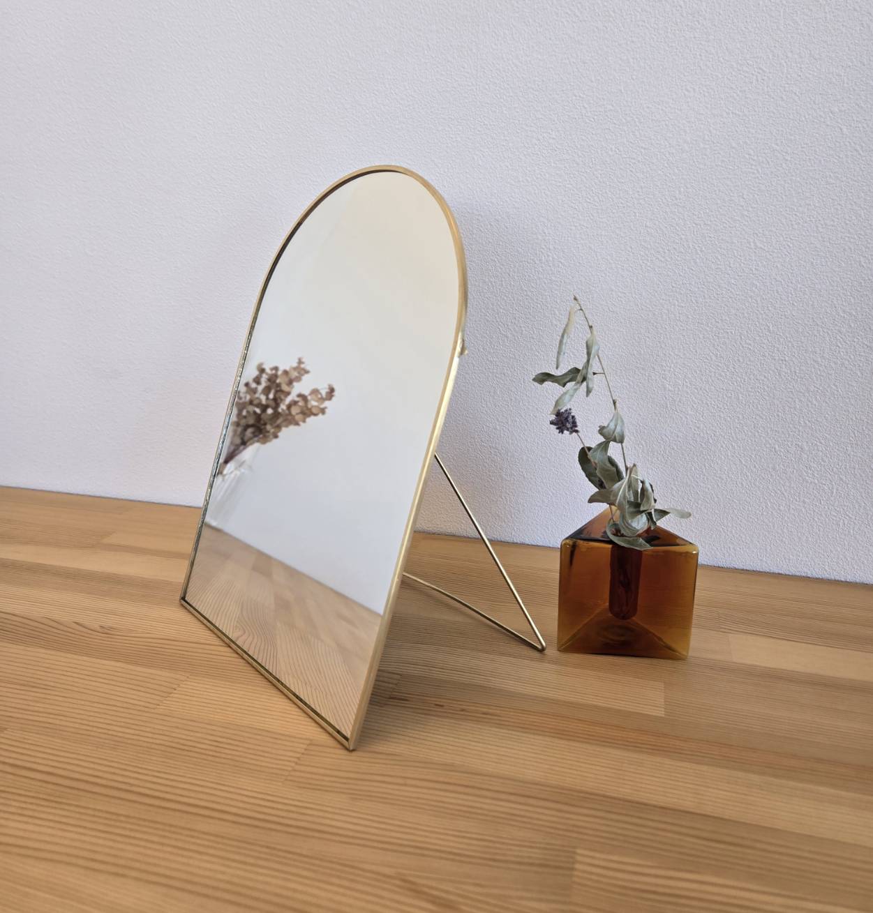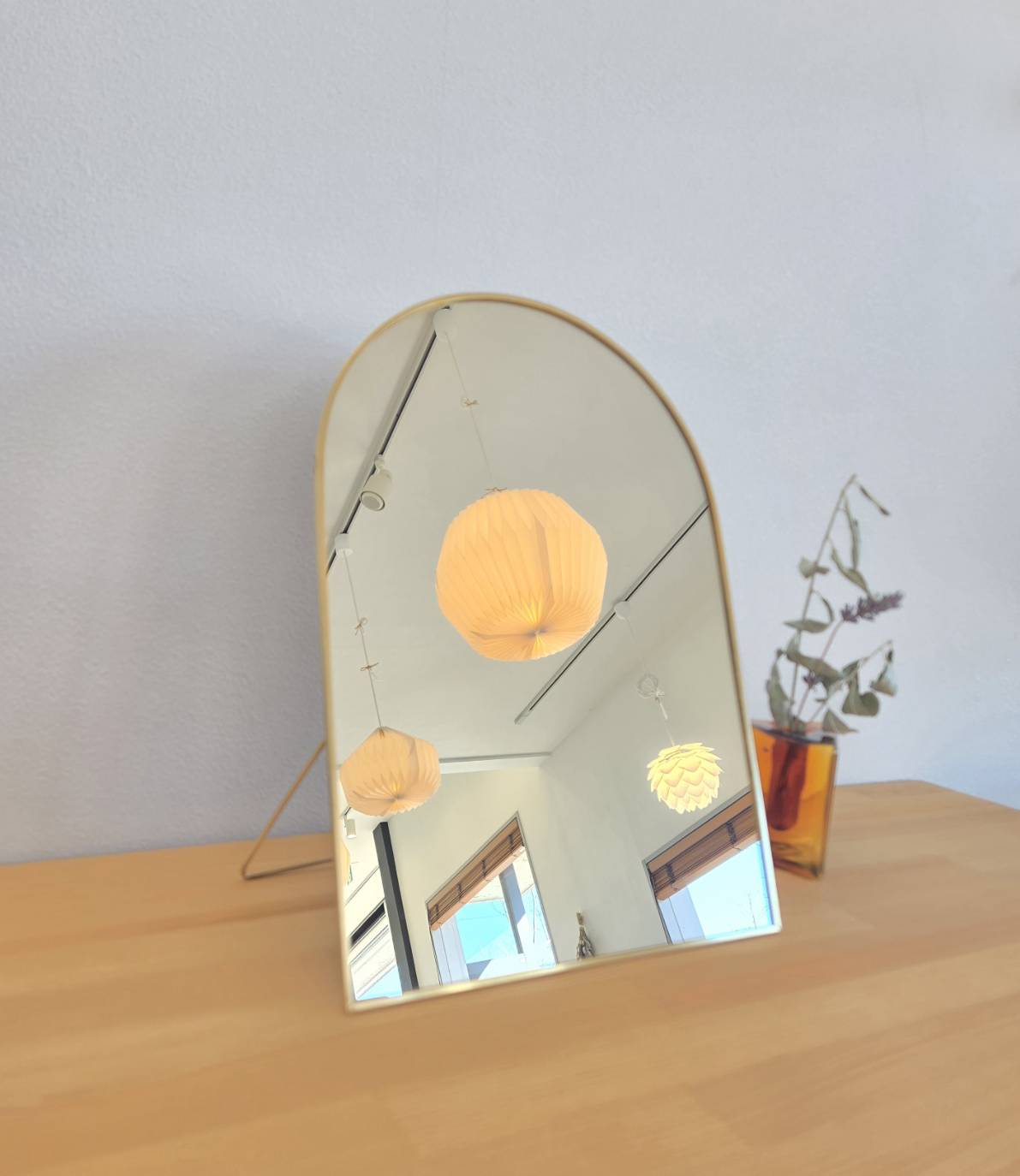 光を反射して空間に広がりをもたらす、ブラス(真鍮)フレームのスタンドミラー。