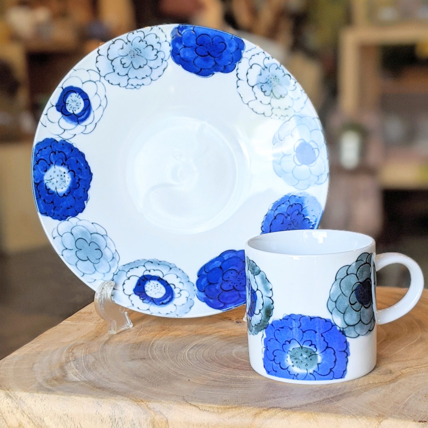 白磁に映える大胆な花模様がかわいらしい美濃焼のプレート&マグカップです。
