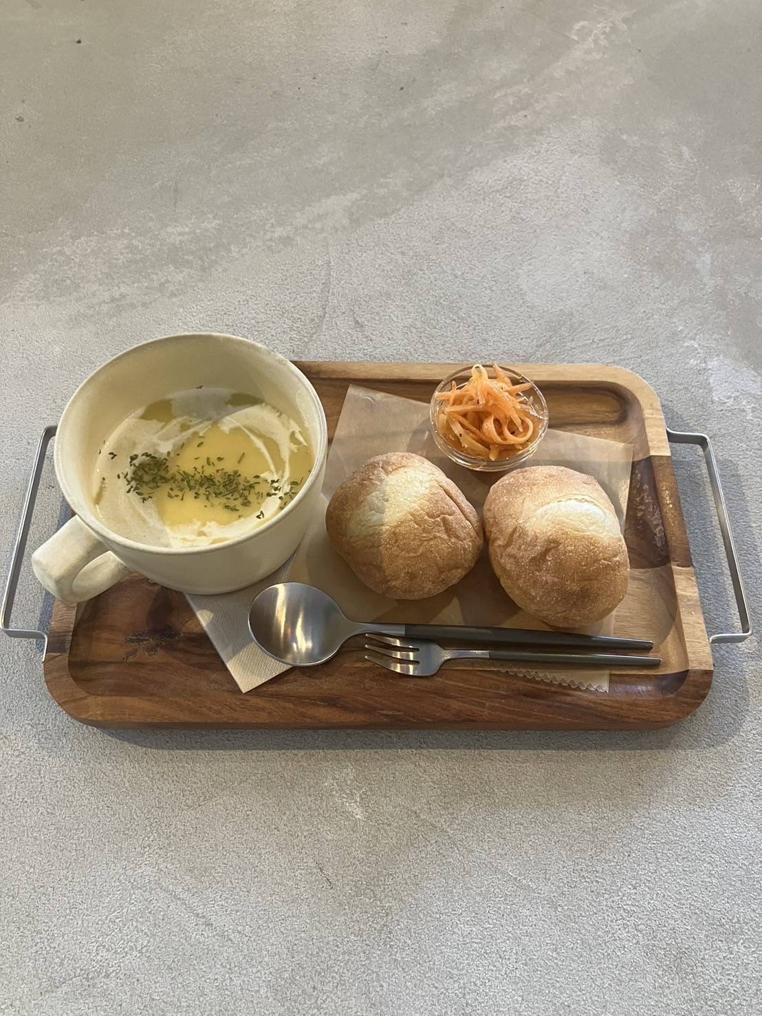 プチパン2つとスープがセットになった軽食メニュー。