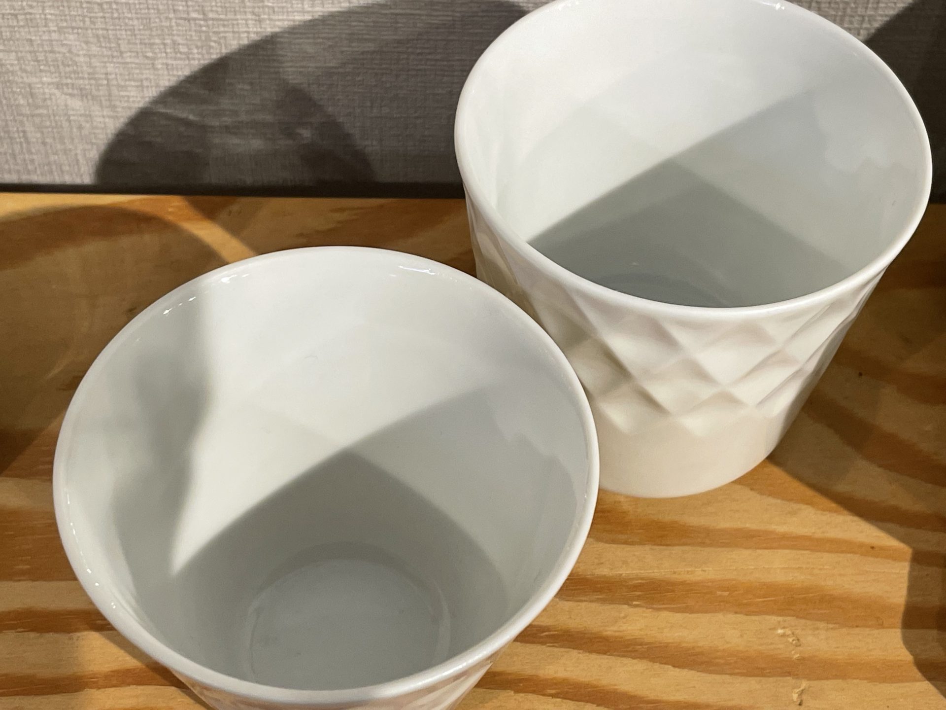 模様の部分が透き通る薄さのコップ。