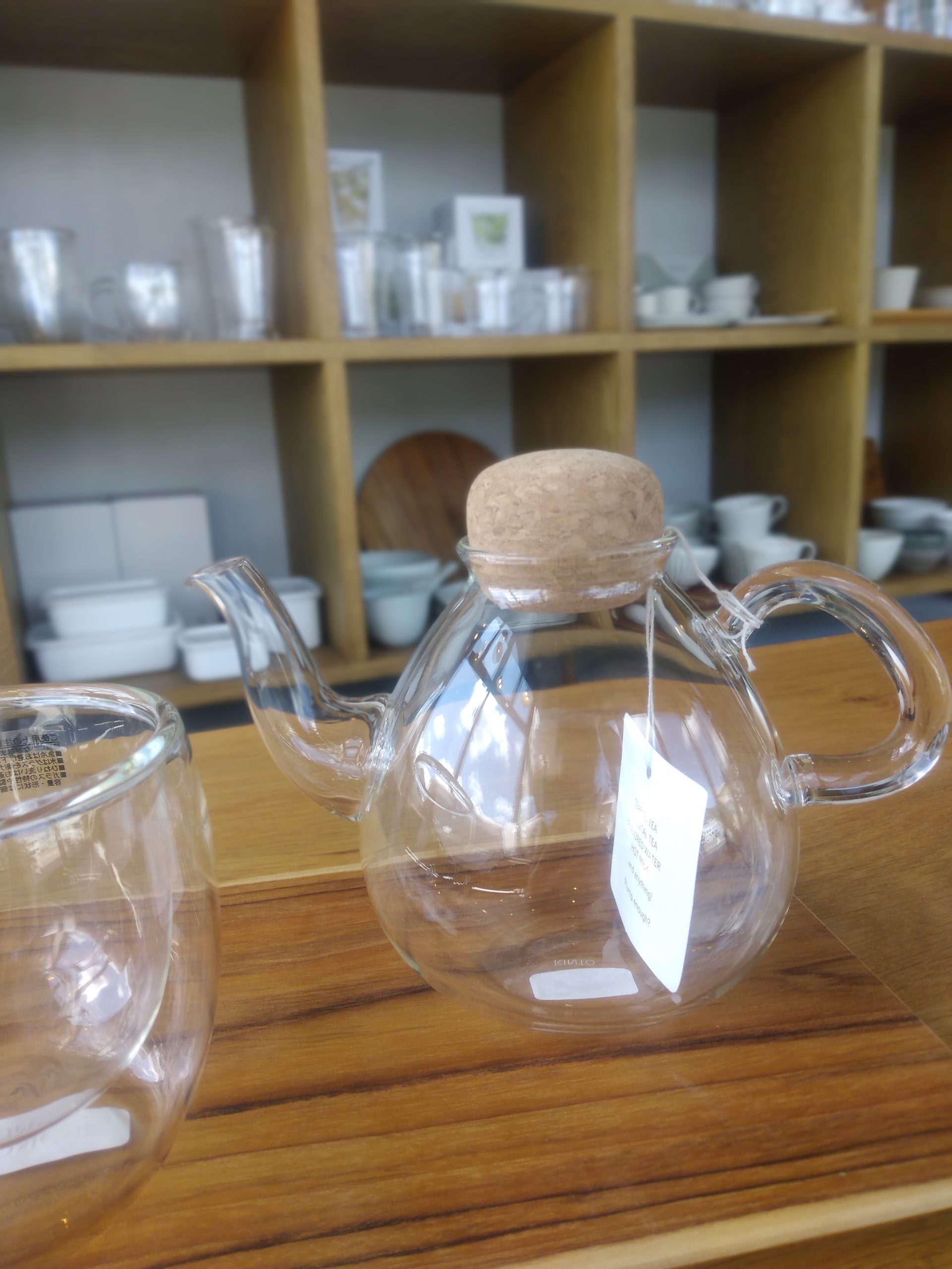 手作り感溢れる、ぷっくりと膨らんだシルエットがなんとも愛らしい、耐熱ガラスとコルクを組み合わせた優しい雰囲気が漂うポット。