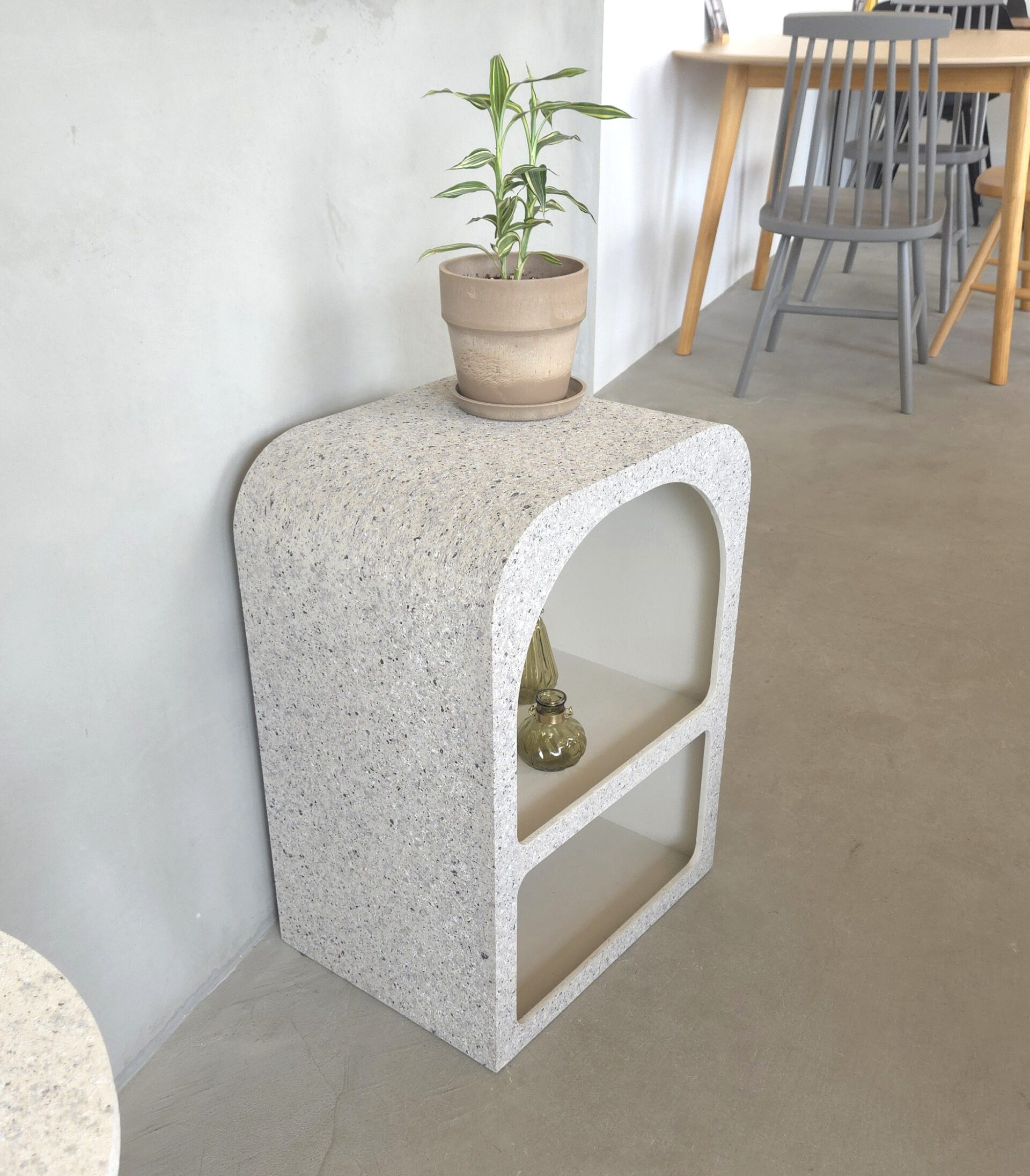 やわらかな曲線と石を砕いたような模様「テラゾー柄」が目を引く二段シェルフ。