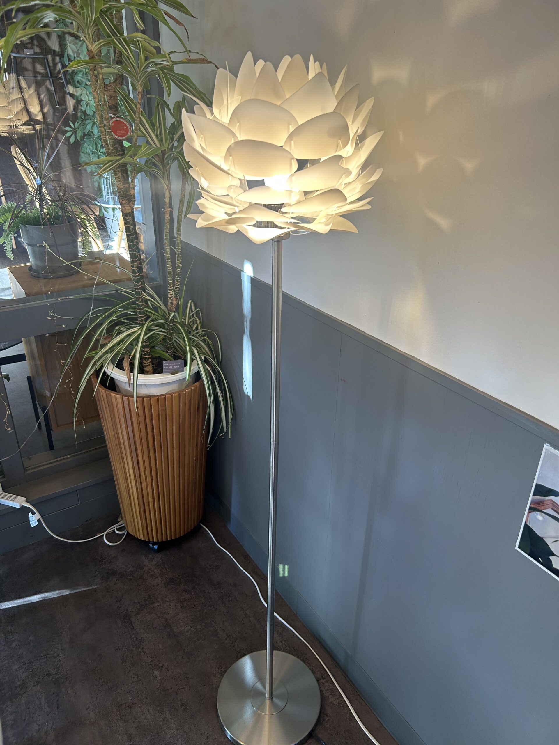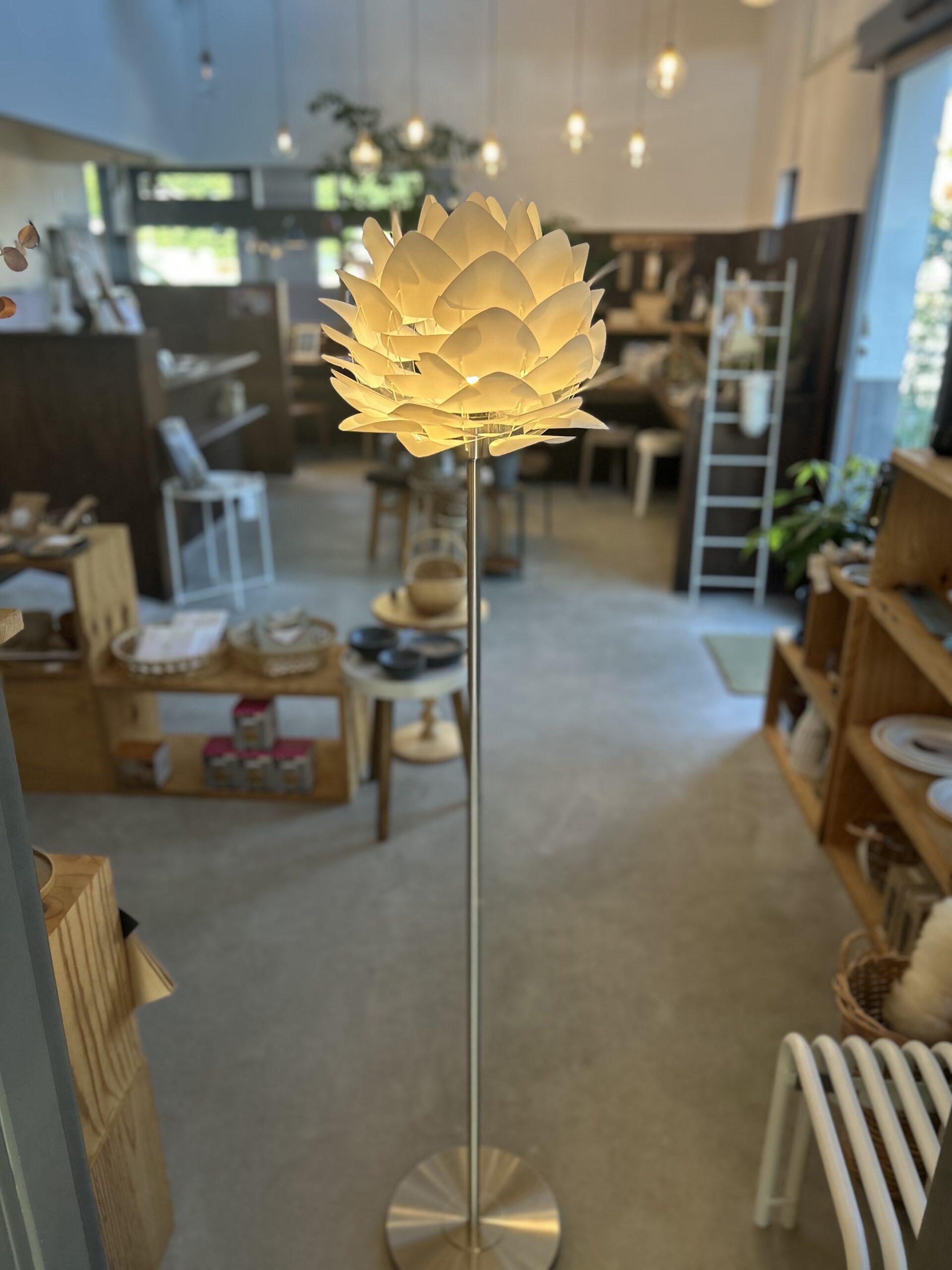 蓮の花や松ぼっくりを模した三角形の羽が幾重にも重なり、柔らかな光を拡散します。