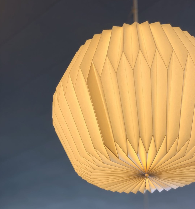 北欧デザインの雰囲気もあり、日本の行燈(あんどん)を彷彿とさせる雰囲気も持っています。紙という素材の持つぬくもり感と、幾何学を構成する立体のフォルムのバランスが新鮮さを感じさせます。軽くて割れない素材は、寝室や階段上の吹き抜けなどにもぴったり。