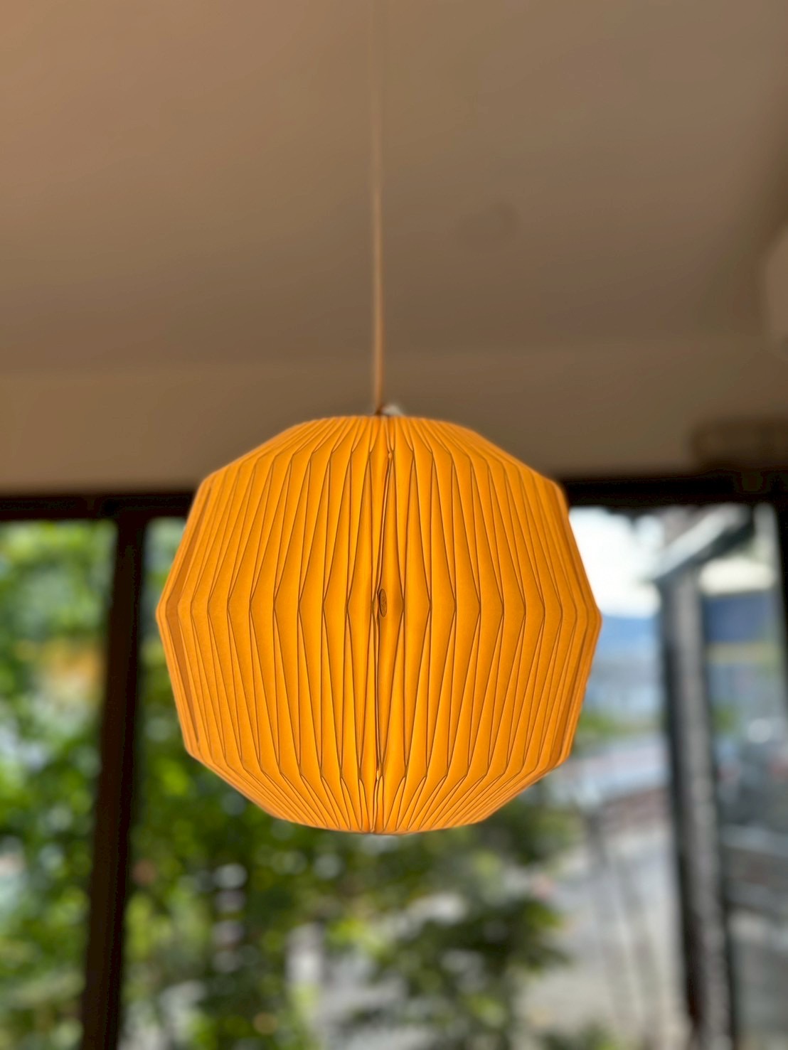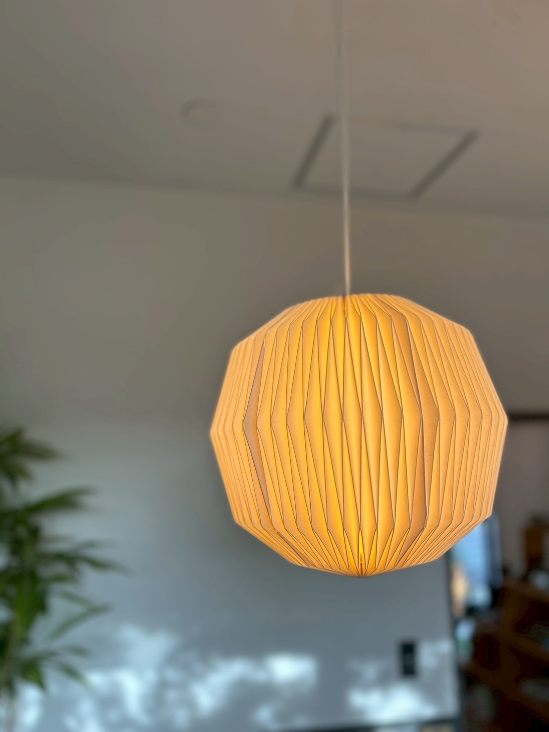 手折りされたオフホワイトの紙シェードが、光を通すことで月のように柔らかく灯り、折り目や角度が陰影を美しく描きます。