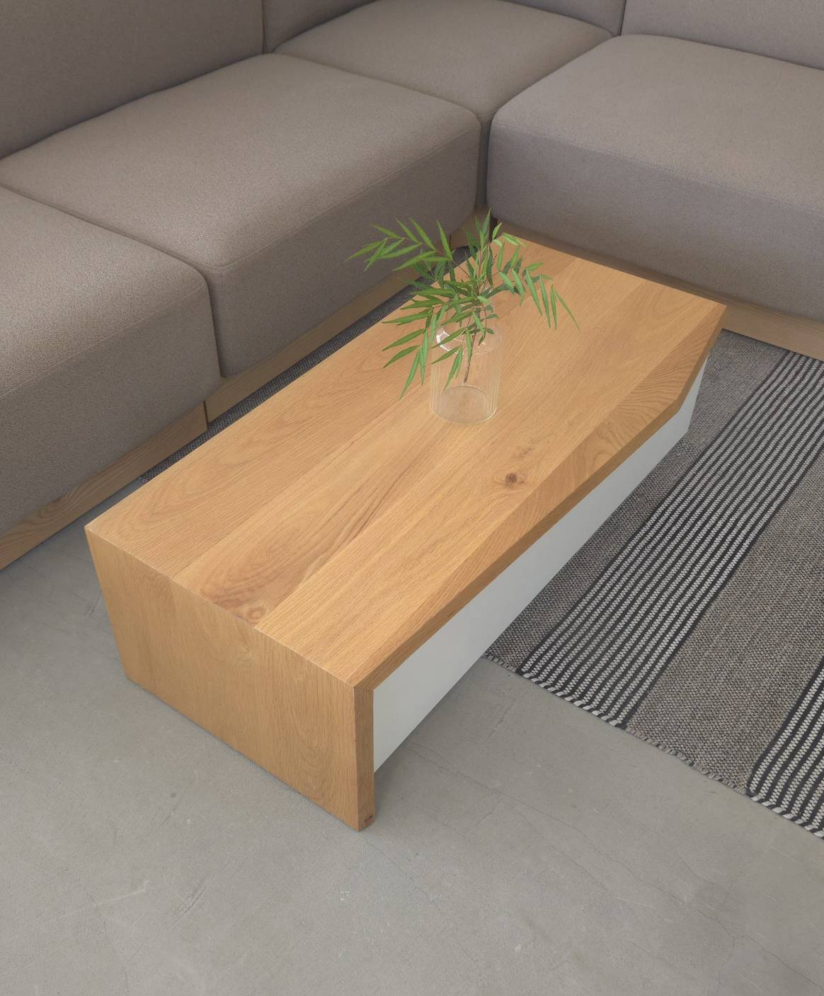 直線と斜めのラインを巧みに組み合わせた、シンプルながら個性が光るローデザインのリビングテーブル。引き出し収納を備えており、リモコンや雑誌、小物などをすっきりと隠せる実用性も魅力です。