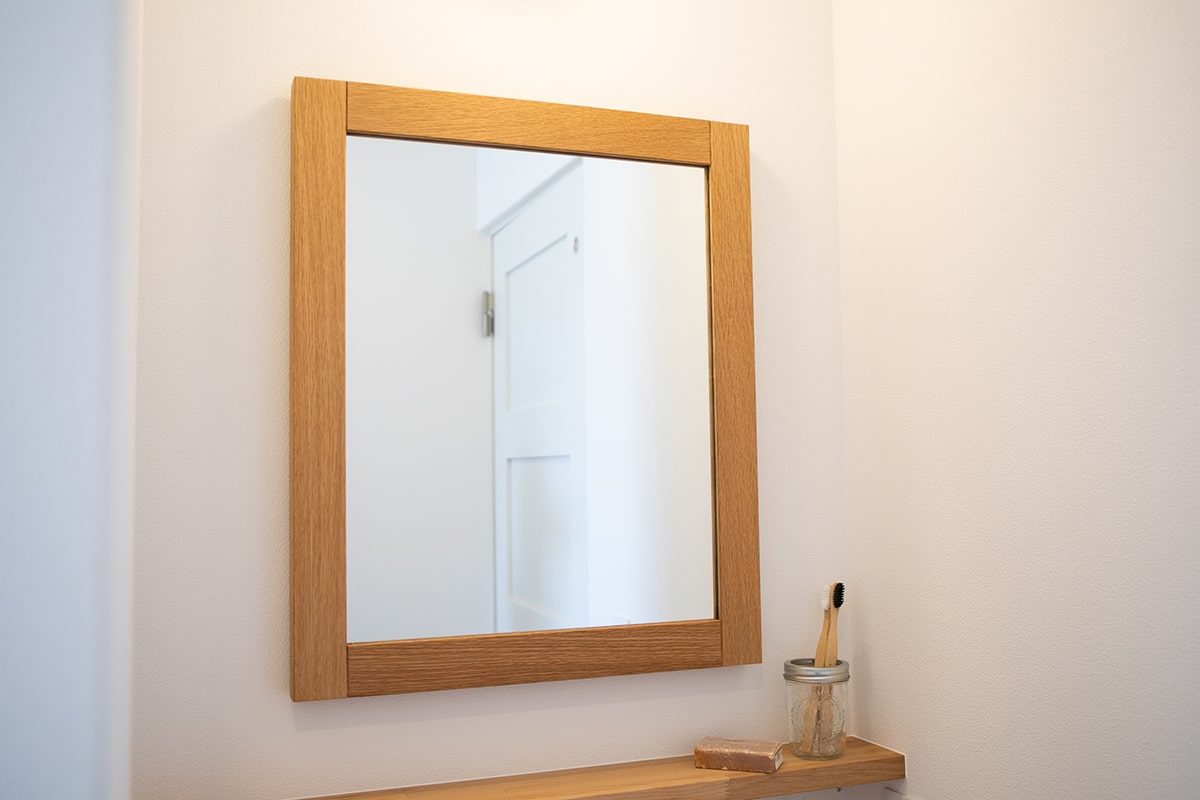 ナチュラルな印象を与える天然木フレームのシンプルミラー。