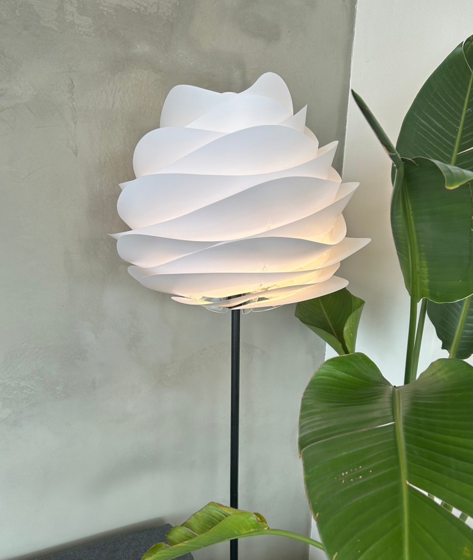 長い羽根をぐるぐるまとった、ドレスのような花のような美しいライト。