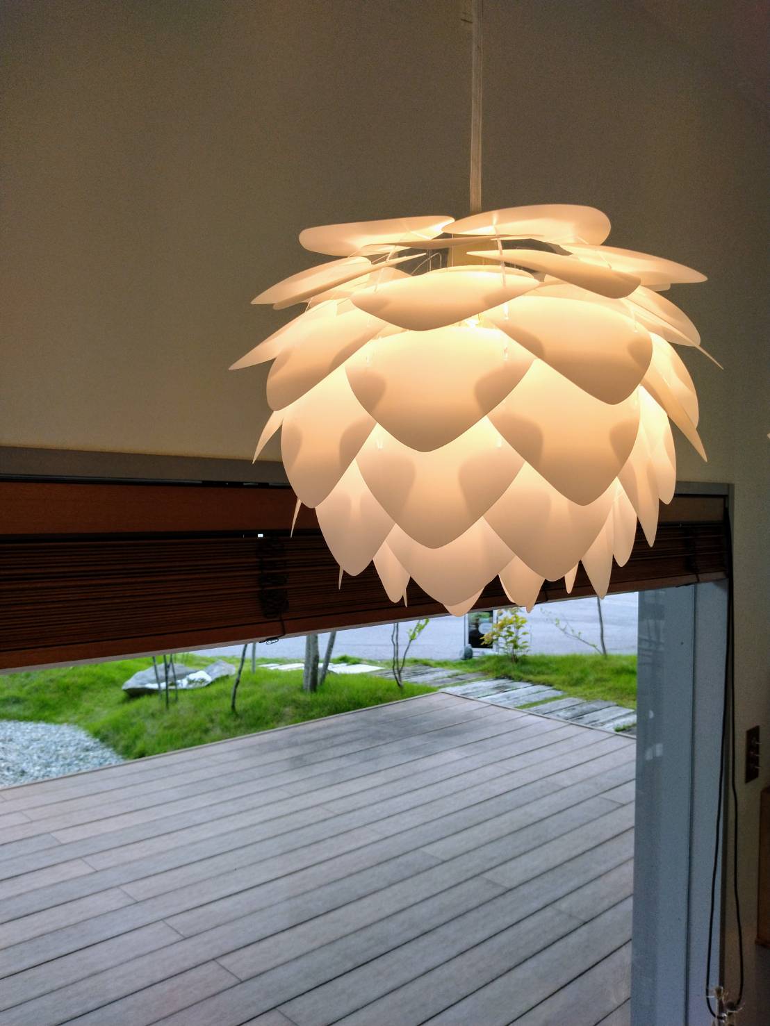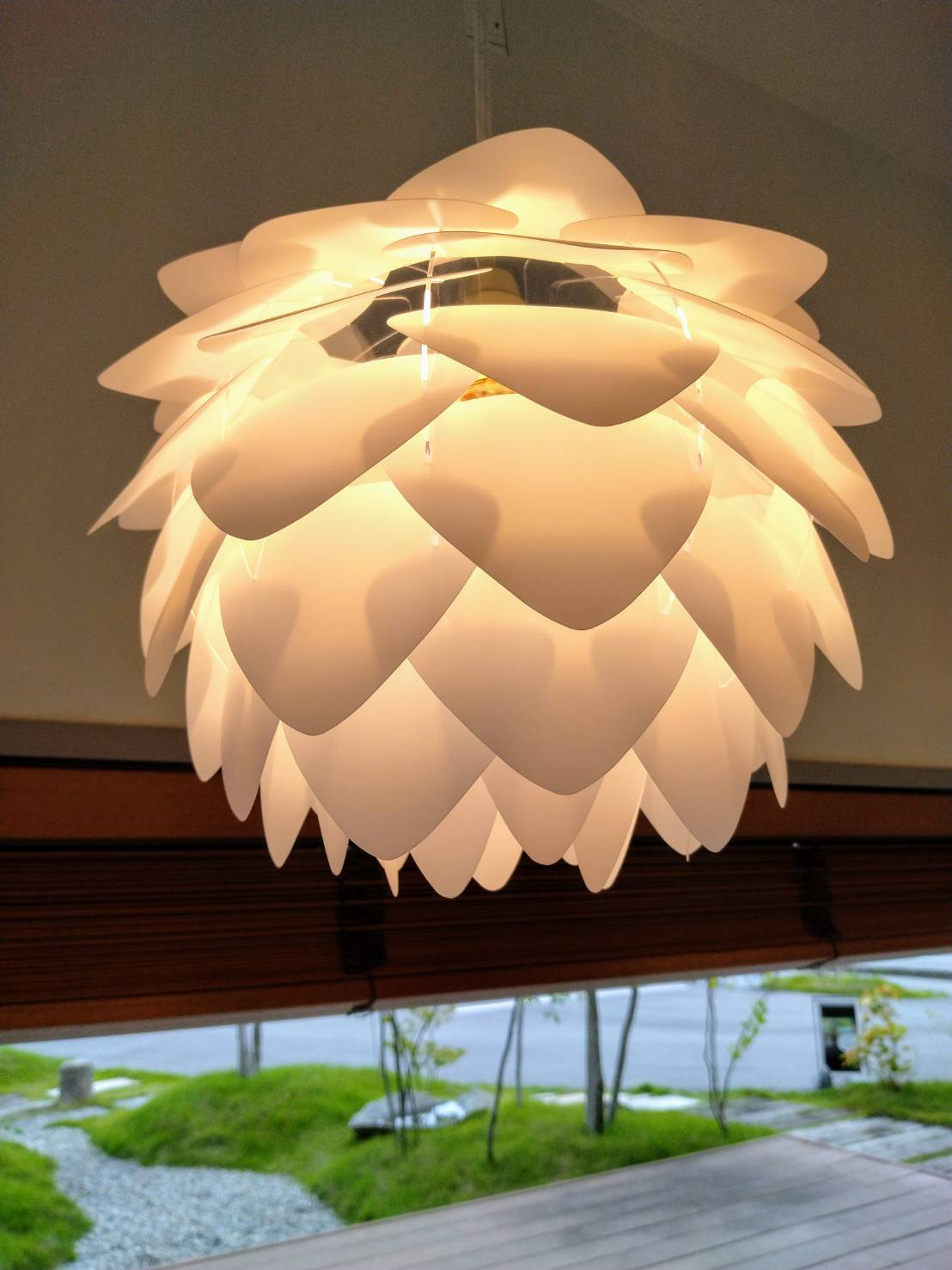 三角形の羽が幾重にも重なって優しいあかりを灯し、お部屋にアクセントを加えます。