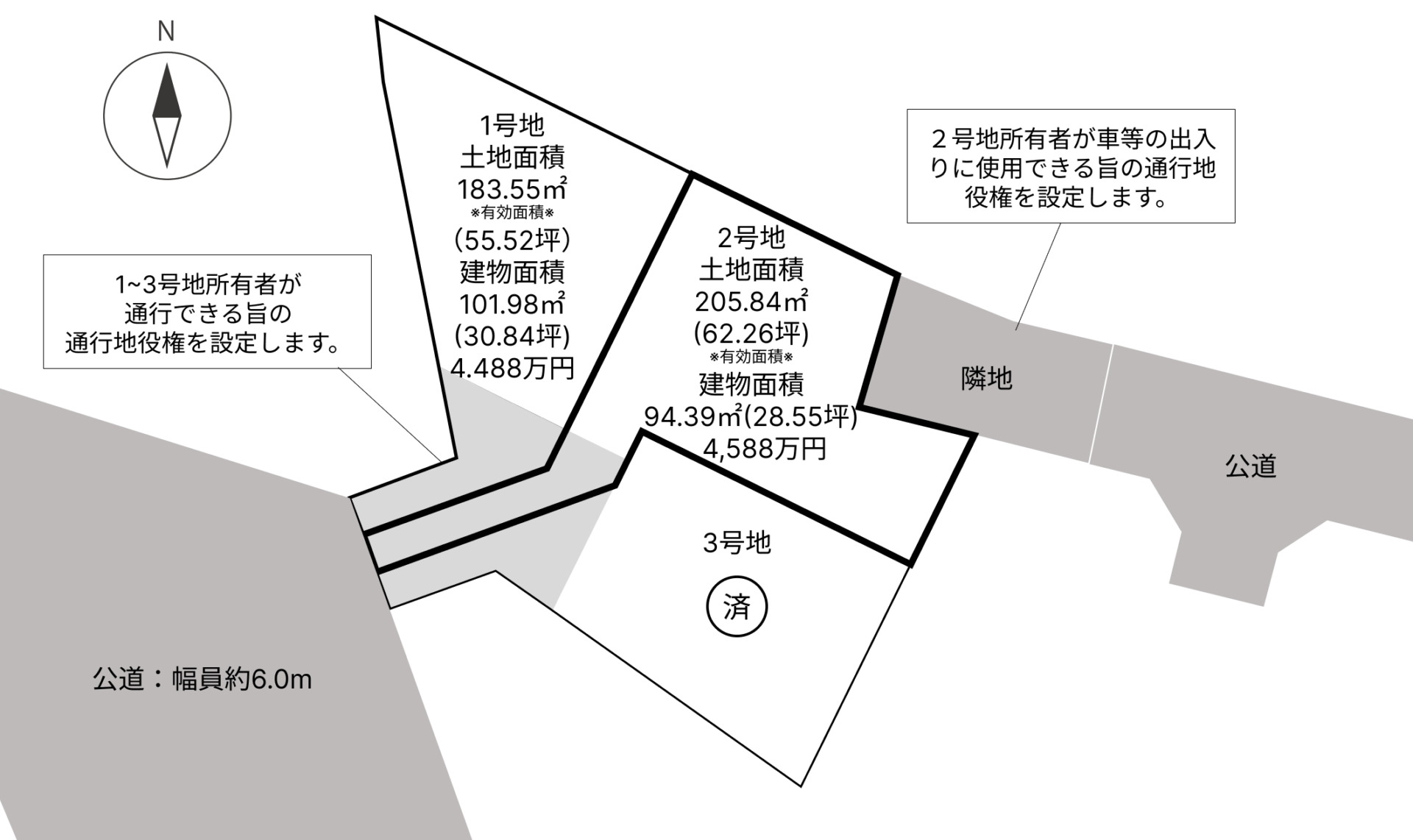 ■2号地に限り北側に通行地役権が設定されており、車等の出入りとして使用します。