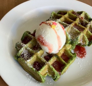 抹茶味のワッフルのグリーンにイチゴソースの赤が映えます♪