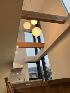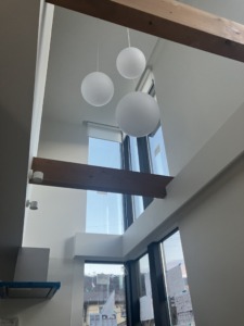 吹き抜けに3つの大きさの違う照明を設置しました。
