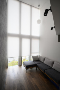 吹き抜け窓を1枚で覆うスタイル。シンプルですっきりとした見た目です。