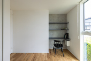 カウンターデスクの上部には、シンプルな棚や収納スペースが設置されており、