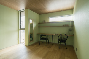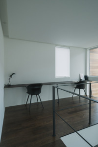 カウンターデスクは、部屋全体に開放感を与えてくれ、広々とした印象を保ちながらも、
