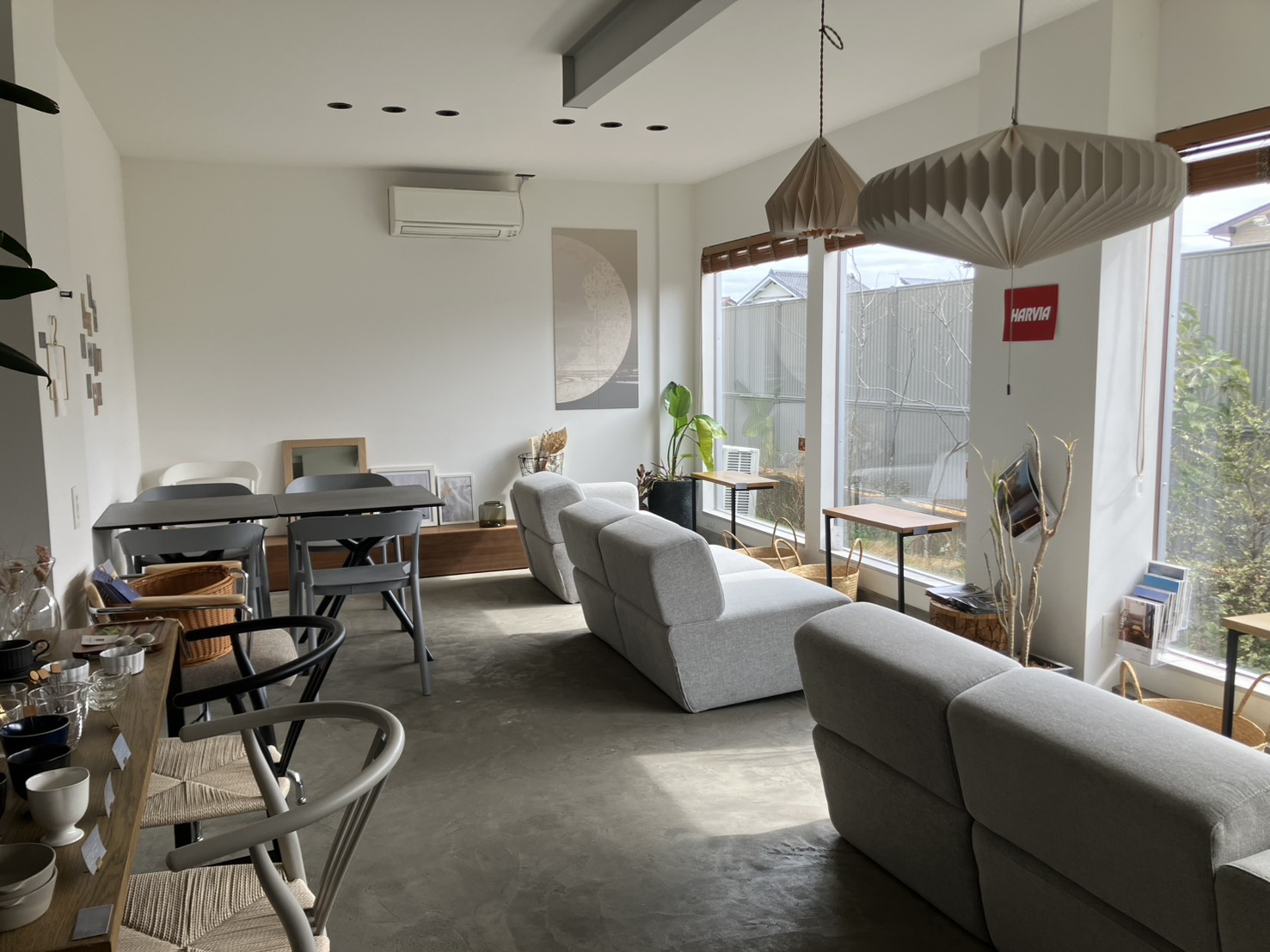1階奥はカフェスペースとなっていて、大きな窓を臨みながらくつろげるソファ席が3席、壁際にテーブル席が1席あります。