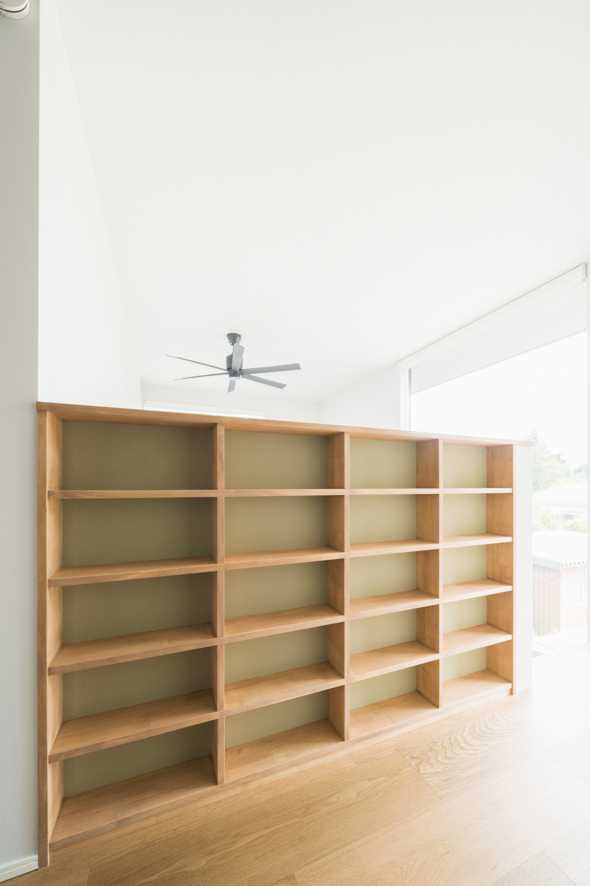 本でいっぱいにする本棚は、廊下の壁を生かして設置しています。