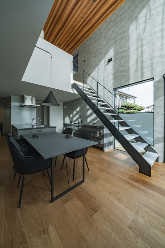リビングやキッチンには直線的なラインを多く取り入れ、視線がすっきりと流れる空間に。